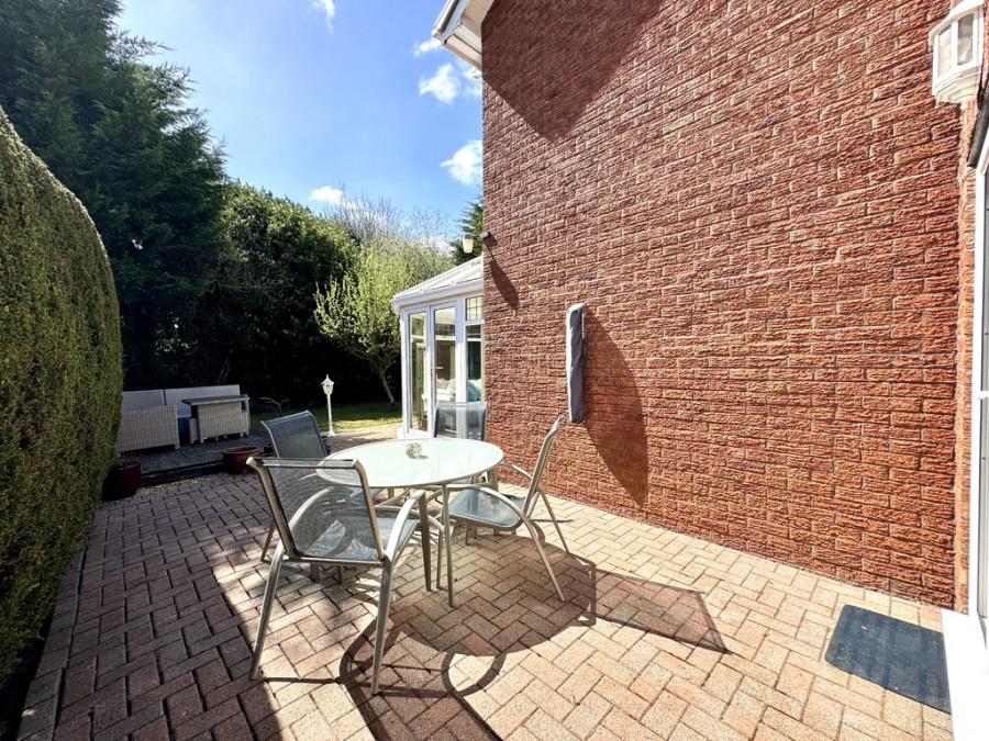 Accessed via gate to large brick paved driveway providing off road parking for several cars leading to double garage with electric door. Garage has plumbing for automatic washing machine and wall mounted gas central heating boiler. Rear garden is enclosed by mature trees and shrubs with large lawn area, decking area housing summer house and further patio to side.