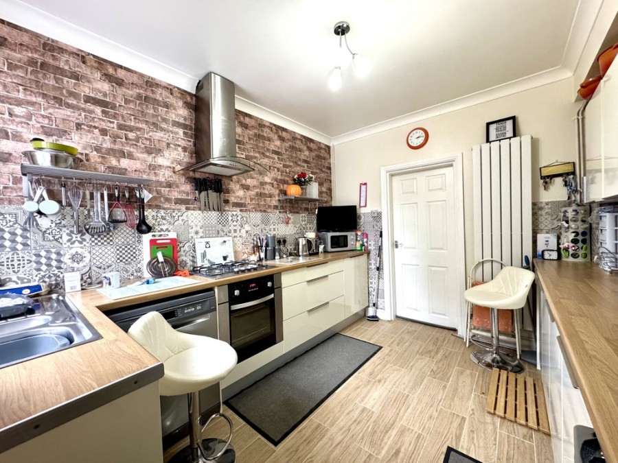 Plumbing for washing machine and worktops, door to rear garden , access to bathroom