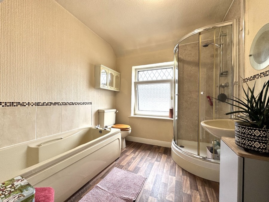 Fitted with a four piece suite comprising panelled bath, corner shower cubicle, pedestal wash hand basin and close coupled w.c. Upvc double glazed window to rear.